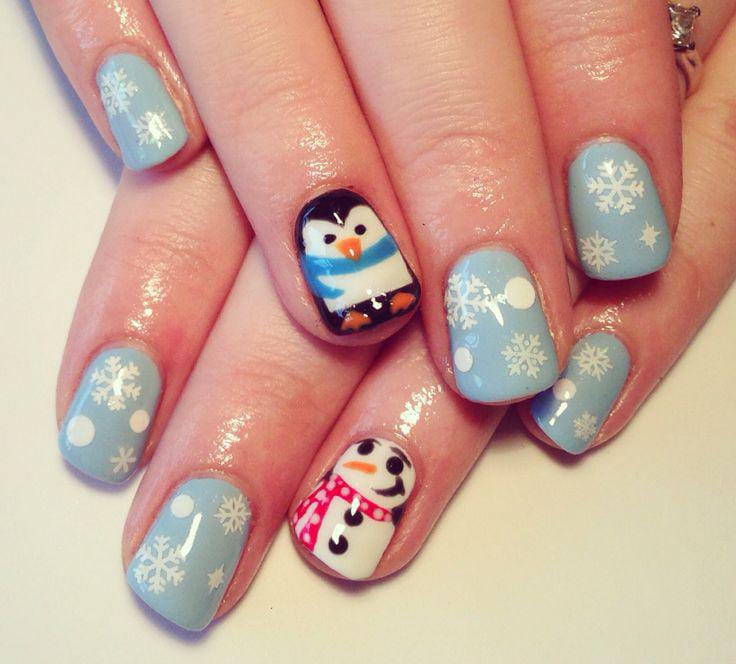 Light blue nails decorated with white snowflakes are paired with adorable penguin and snowman art for a cheerful, cozy winter theme. It’s bright, cute, and perfect for a fun December manicure.