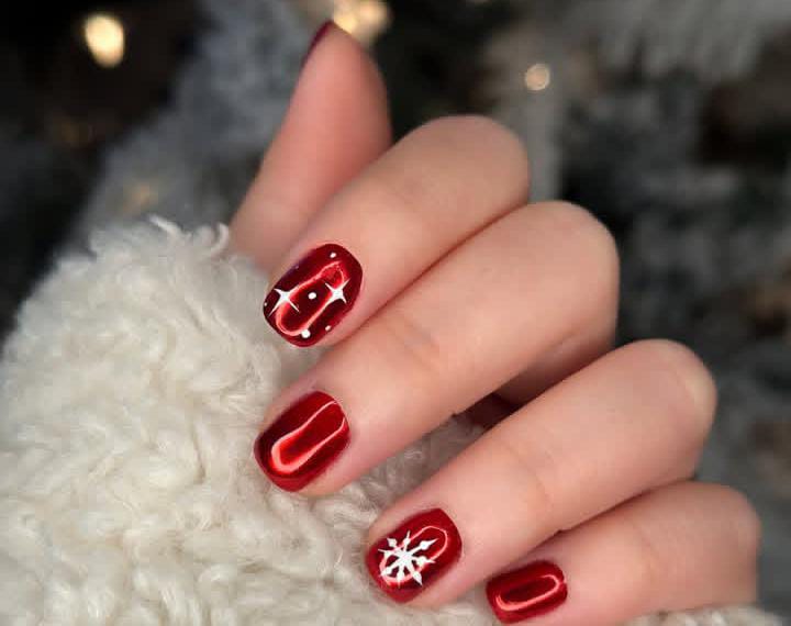 This look pairs rich, glossy red nails with tiny festive accents, including a soft sparkle effect and a delicate white snowflake that gives it a classic December charm. It’s bold yet simple, perfect for adding a touch of holiday shine.