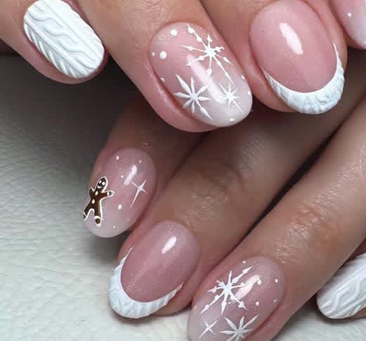 A soft nude base meets cozy white sweater-textured tips and delicate star-snowflake patterns, creating a dreamy winter December aesthetic. The tiny gingerbread accent adds a cute, warm holiday touch without overwhelming the design.
