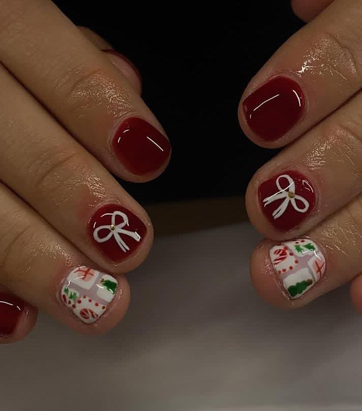 Deep red nails are mixed with playful white accent nails decorated like wrapped presents, creating a fun and cheerful Christmas-morning feel. The tiny bow designs add just the right amount of December charm.