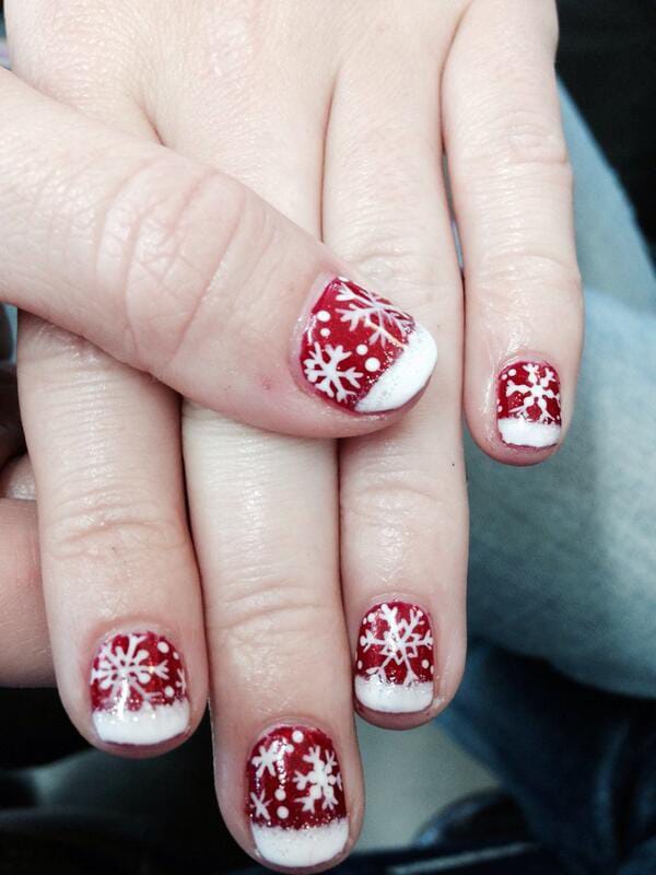 Bright red nails with crisp white snowflakes and snowy curved tips give this design a classic Christmas vibe, balancing bold holiday color with playful December winter detailing.