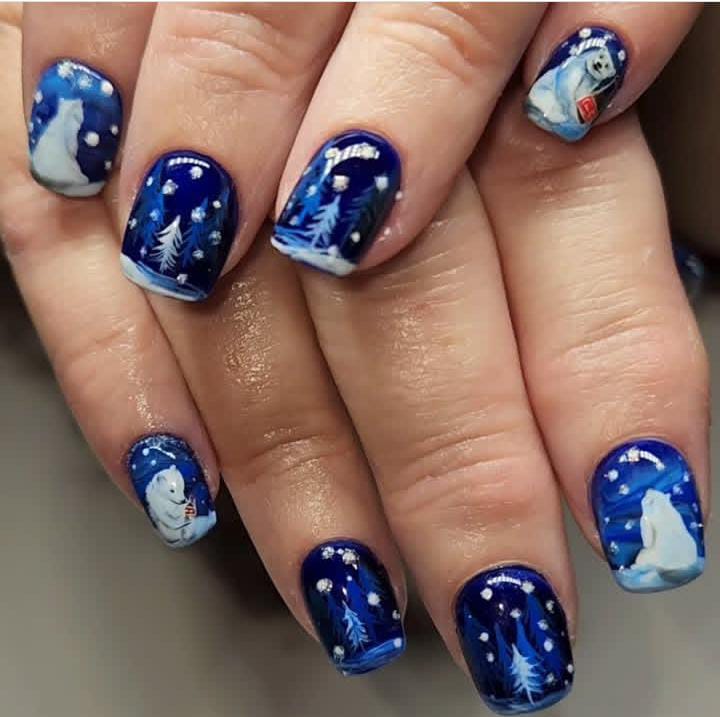 A deep blue backdrop sets the stage for snowy trees and adorable polar-critter scenes, giving these nails a detailed, storybook-style winter atmosphere. The design feels cozy, whimsical, and perfect for December.