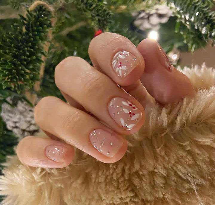 This design features soft nude nails with delicate white leaf-like strokes and tiny red accents, creating a subtle winter-berry feel perfect for December. The whole look is gentle, minimal, and cozy.