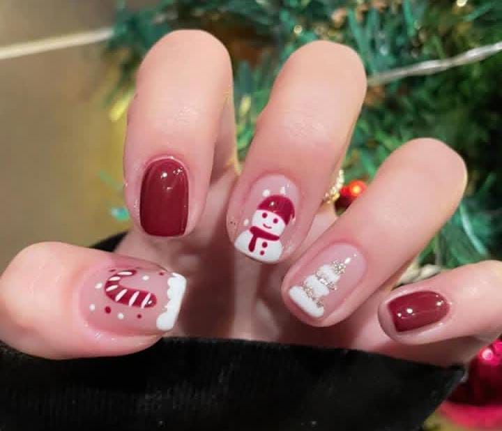 A playful combination of deep red nails and cute holiday art, including a snowman, candy cane, and a tiny Christmas tree. It blends classic December colors with a fun, youthful vibe.