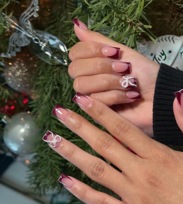 These nails showcase glossy burgundy French tips paired with simple white bow designs, giving a polished but festive gift-wrapped effect. It’s elegant, modern, and perfect for December holiday parties.