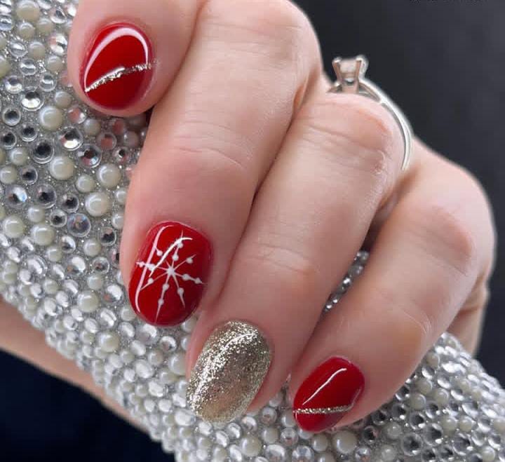 Bold red nails are paired with a glittering gold accent nail and fine white line details, giving a classic Christmas color scheme a sleek, modern twist. It’s vibrant, festive, and perfect for the holiday and December season.