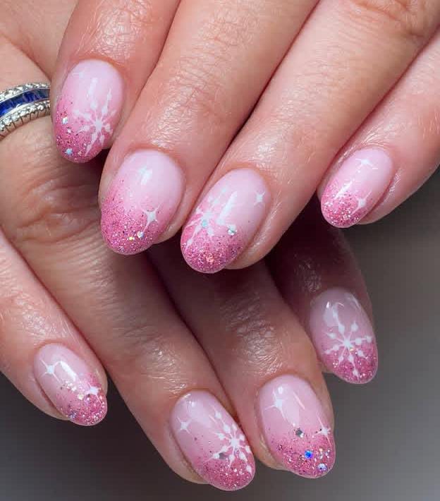 A rosy pink-to-glitter gradient topped with subtle white sparkles gives this set a frosty, festive vibe. It’s bright, feminine, and perfect for a cheerful December style.