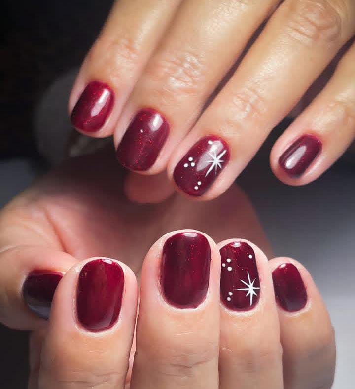 Rich cranberry polish paired with a single starburst accent nail creates a bold yet elegant winter look. The deep color adds warmth while the subtle white details add a touch of December holiday sparkle.