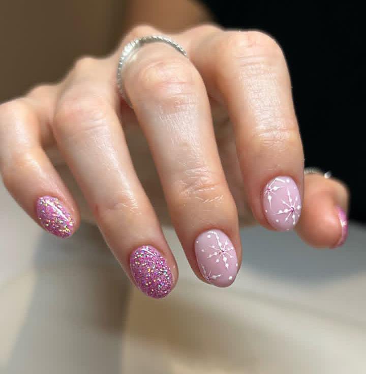 Soft pink nails mixed with full-glitter accents and white star-shaped details give this design a sweet, magical feel. It blends shimmer and simplicity for a charming December aesthetic.