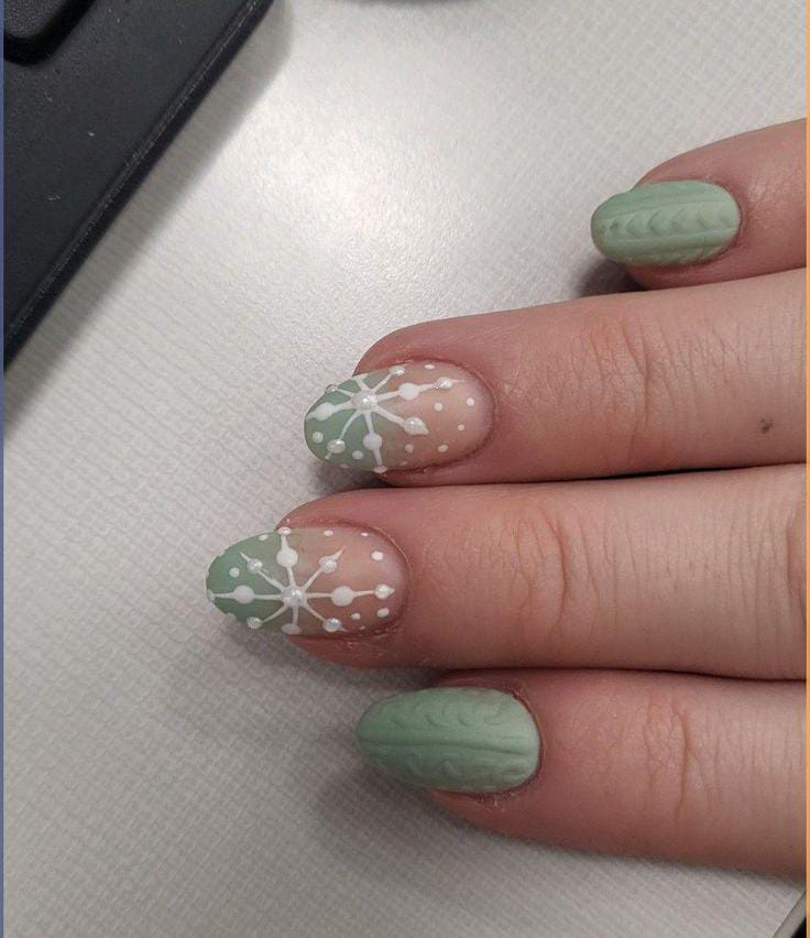 Soft mint green tones and nude bases are paired with white snowflakes and subtle sweater-texture accents, creating a calm, cozy winter look that feels both seasonal and December stylish.