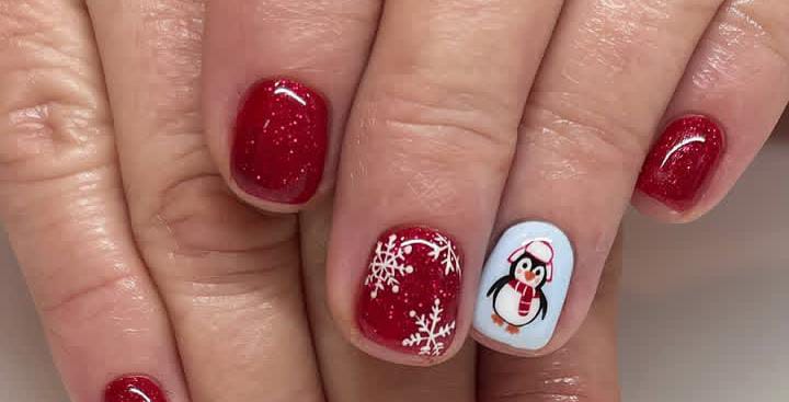 Vibrant red glitter nails paired with a snowflake accent and an adorable little penguin create a playful holiday theme. It’s festive, fun, and full of December cheer.