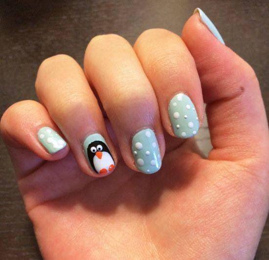 Soft icy blue nails are dotted with raised white “snow,” while an adorable penguin accent nail adds a playful touch perfect for light-hearted winter December vibes.