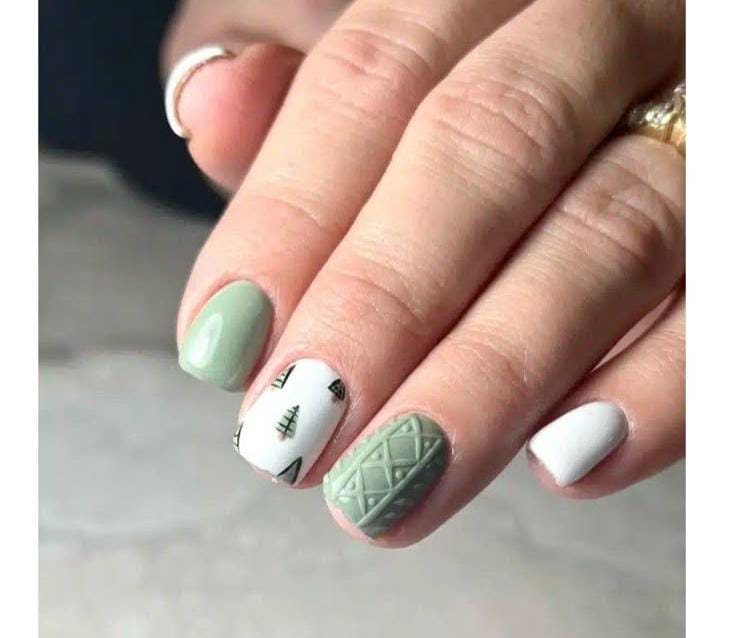 A calming mix of sage green and crisp white is paired with tiny minimalist trees and a sweater-texture accent, giving the nails a clean, modern December holiday feel.