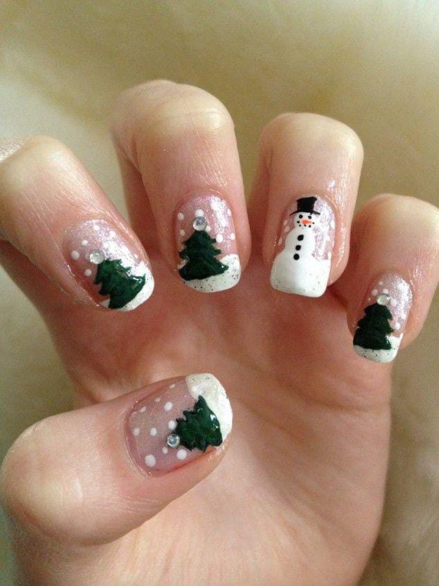 These nails show a charming winter landscape with hand-painted trees, falling snow, and a simple snowman, creating a whimsical, snowy- December day aesthetic.