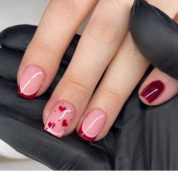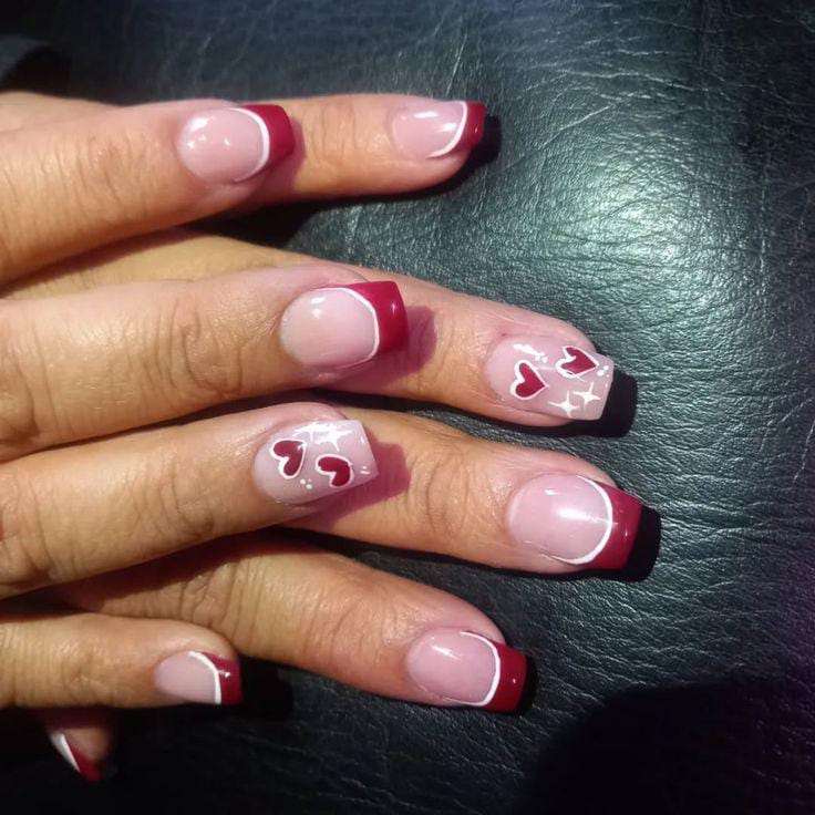 Soft pink nails feature deep red French tips with delicate white heart accents. The look feels romantic, playful, and perfect for Valentine’s Day.