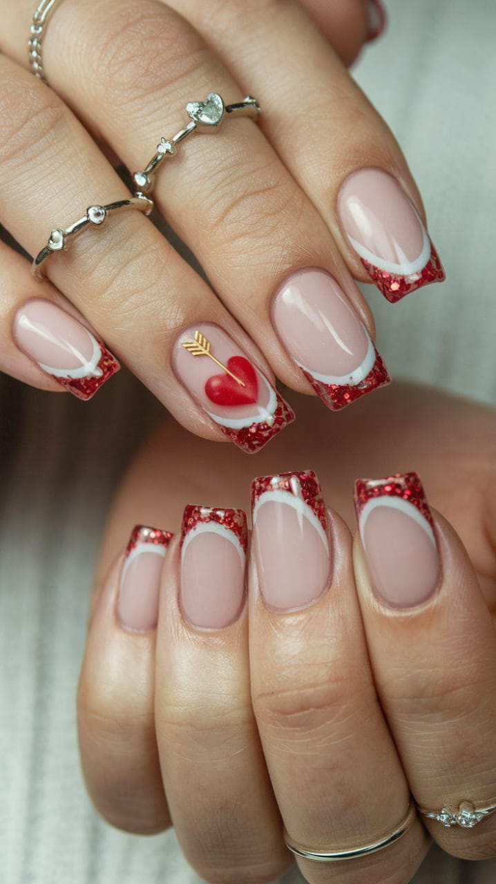 Soft nude nails are paired with classic white French tips finished in red glitter. A single heart accent adds a romantic Valentine’s touch without feeling overdone.