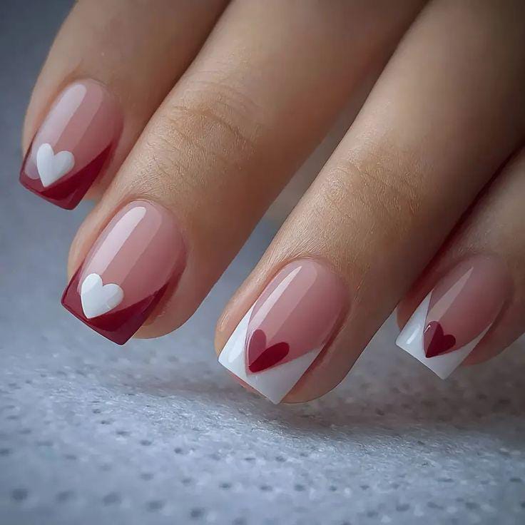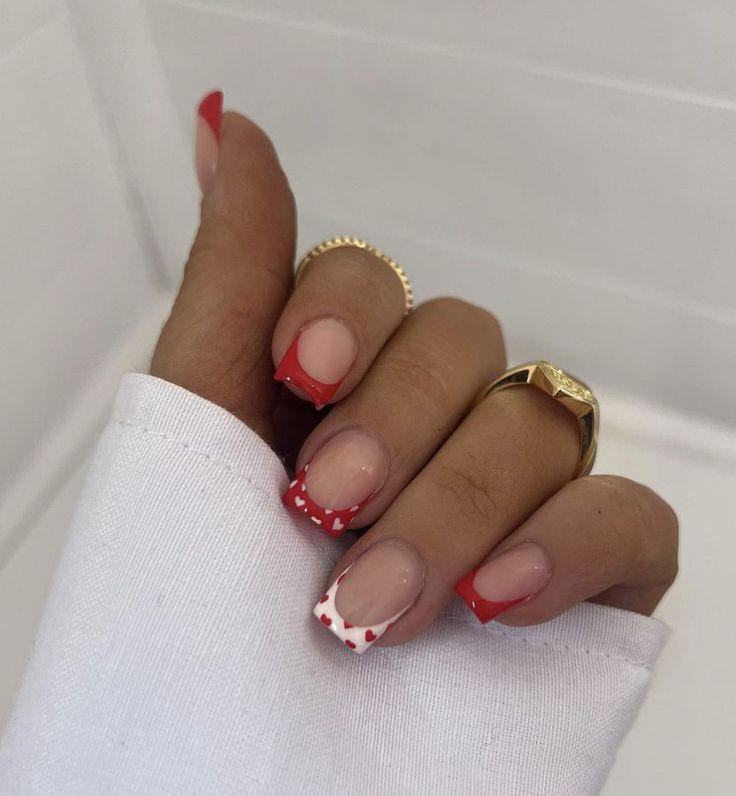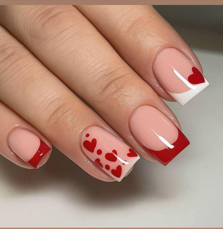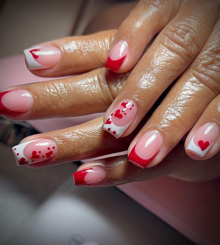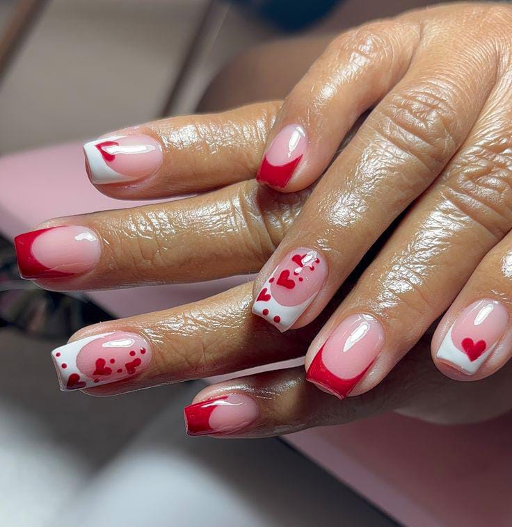 Red and white French tips are mixed with heart and dot accents over a nude base. The design feels bold, festive, and full of Valentine energy.