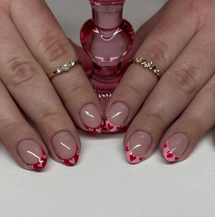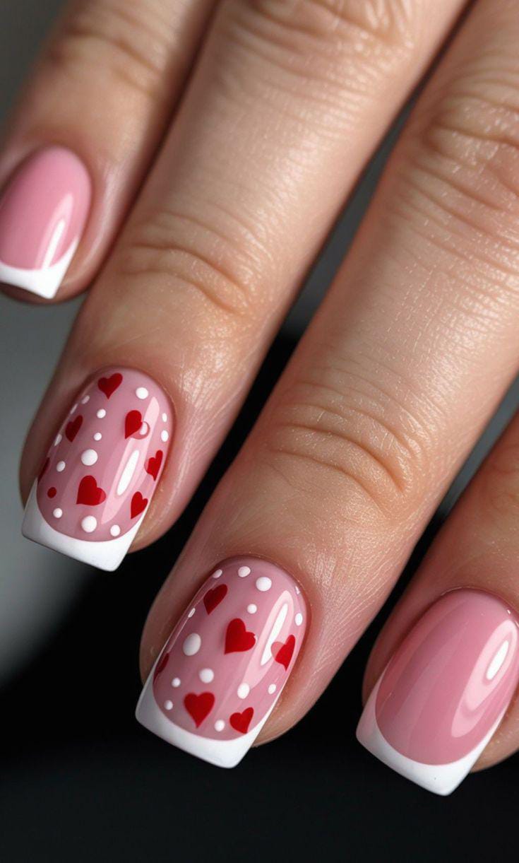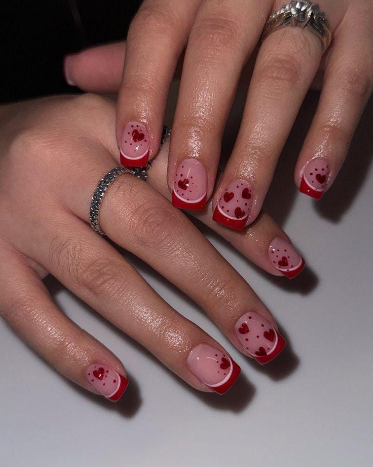 Short pink nails have red French tips with tiny heart and dot details scattered lightly across the surface. The overall vibe is soft, flirty Valentine, and elegant.