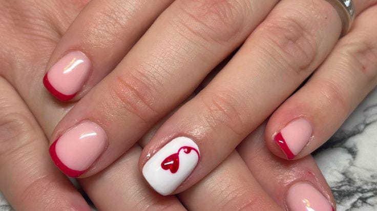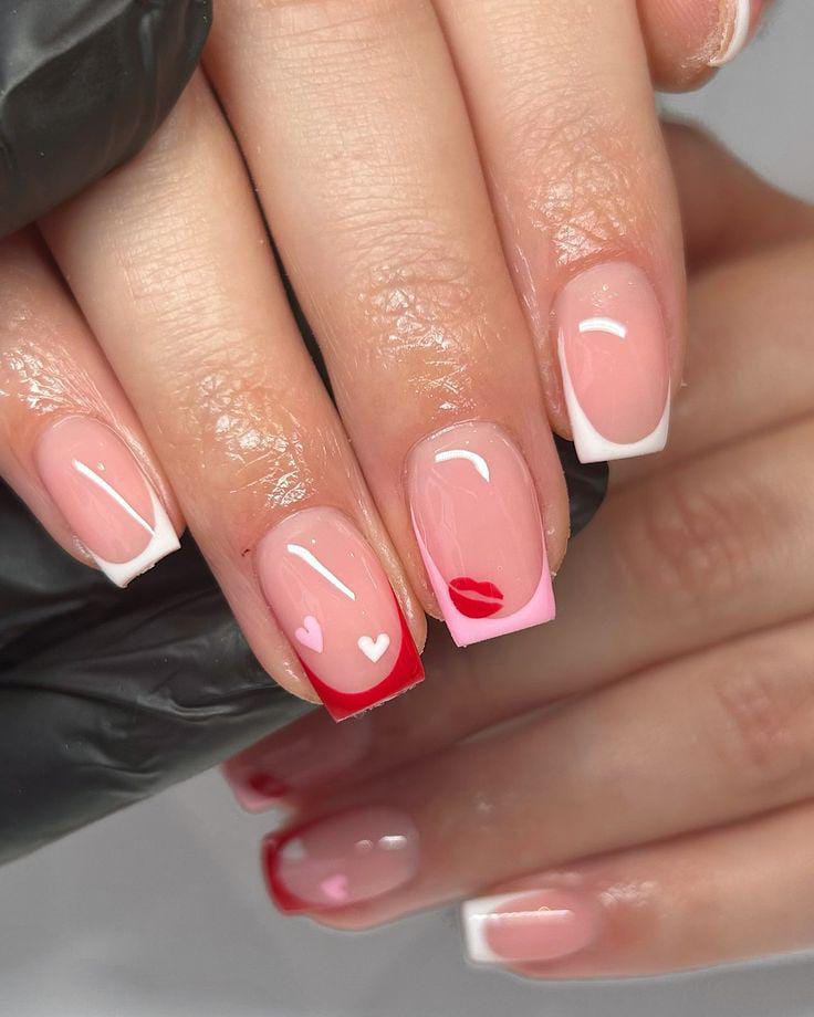 A classic short French tip look with white, pink and red tips, paired with subtle heart and lip details. It feels modern, clean, and softly romantic Valentines.