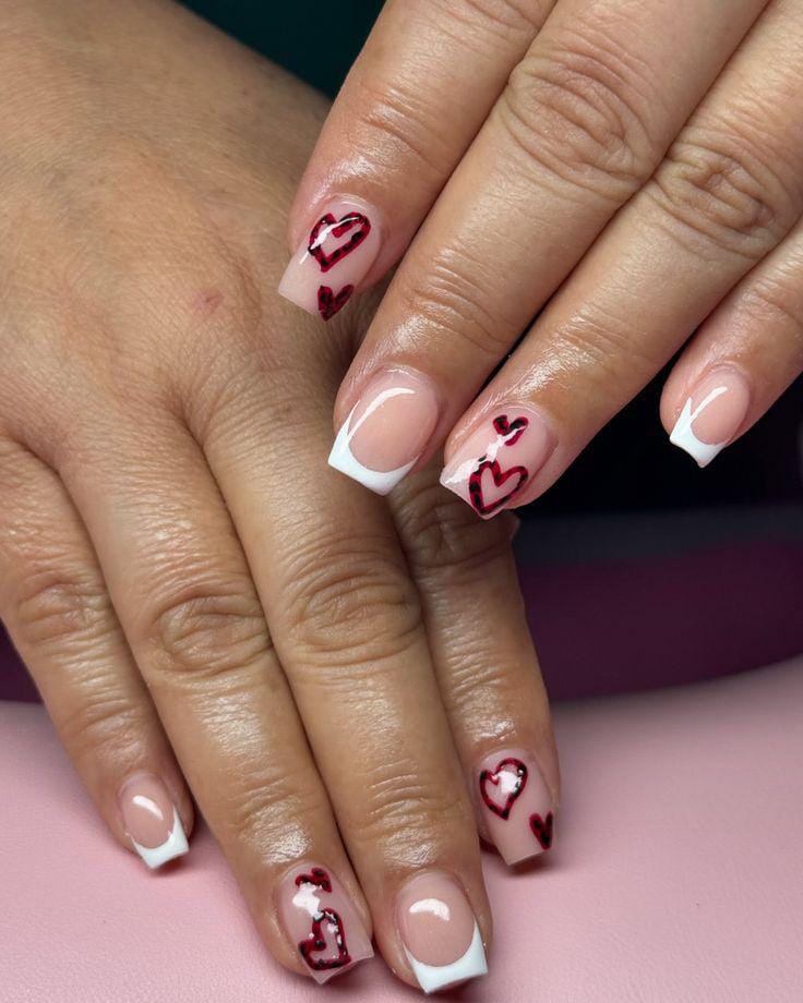 Clean white French tips are paired with hand-drawn red and black heart outlines on accent nails. The design feels artistic, trendy, and slightly bold while staying romantic Valentines.