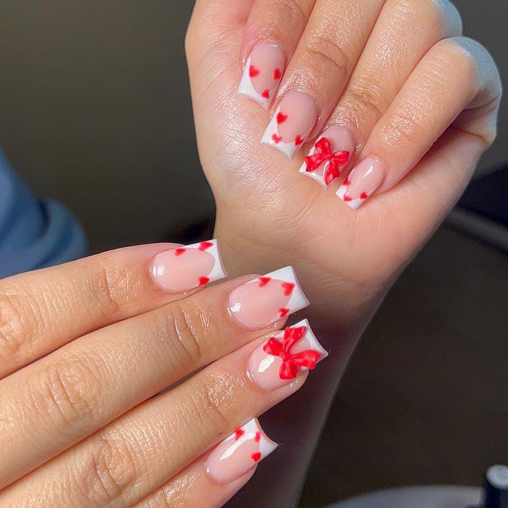 These short French tips feature a sheer pink base with red hearts and cute bow accents. The style is playful, glossy, and slightly dressy Valentines without feeling heavy.
