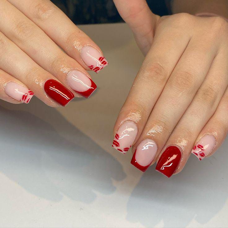 A nude base is styled with red French tips and flowing swirl accents. Small heart details and shimmer lines give it a playful yet elegant Valentine’s feel.
