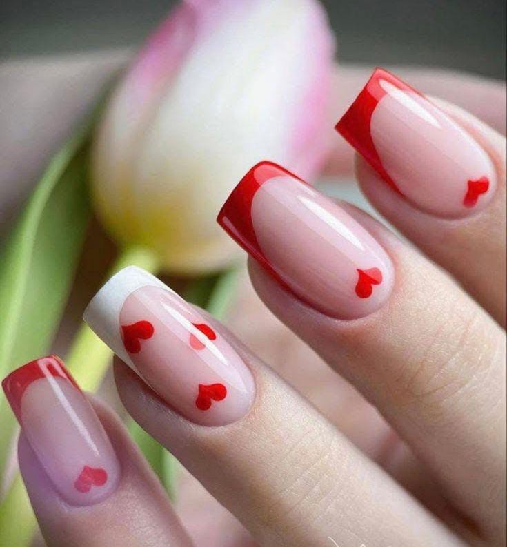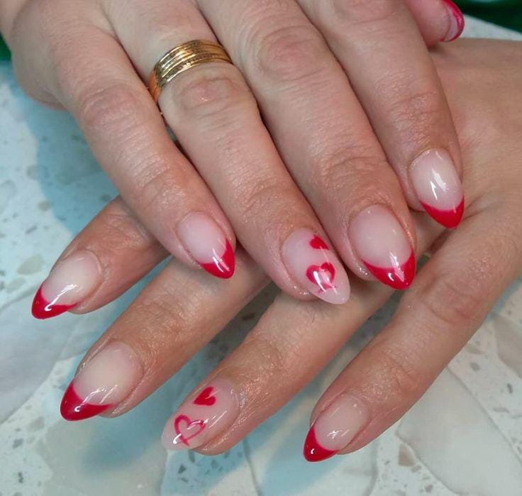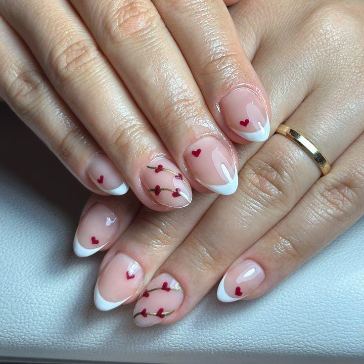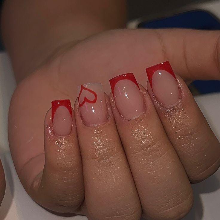 Soft nude nails are paired with classic red French tips, some accented with tiny heart details. The look feels clean, romantic, and perfect for a subtle Valentine vibe.