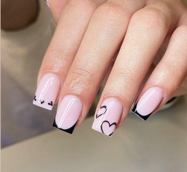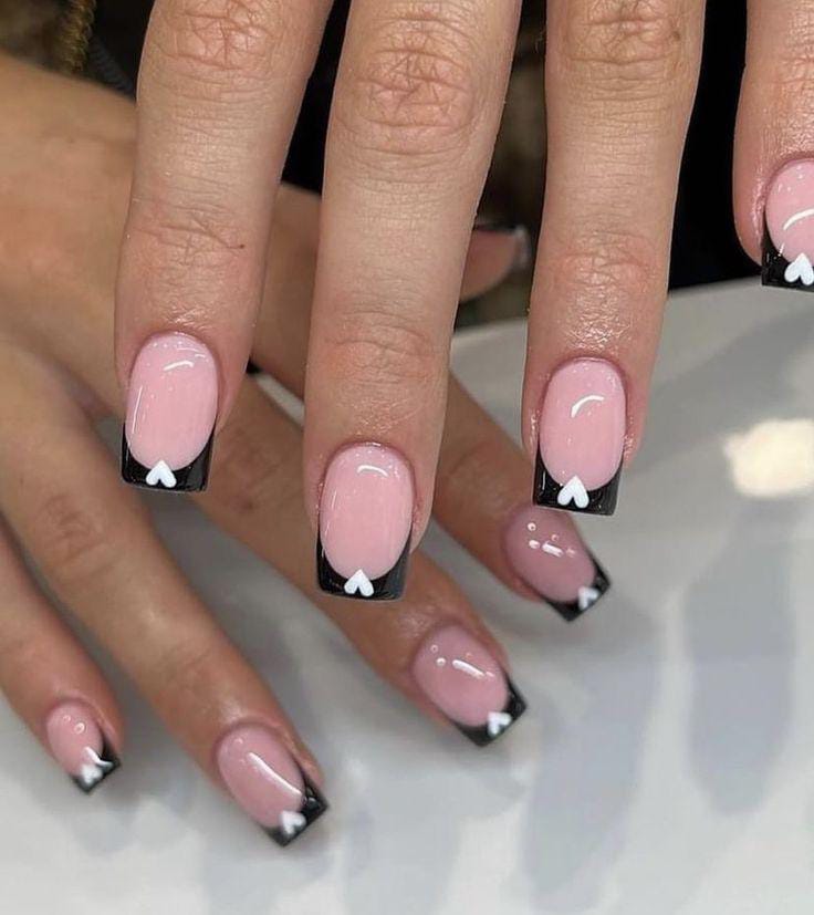 Soft pink nails are paired with sleek black French tips and tiny heart accents for a chic Valentine vibe. The look feels modern, minimal, and subtly romantic.