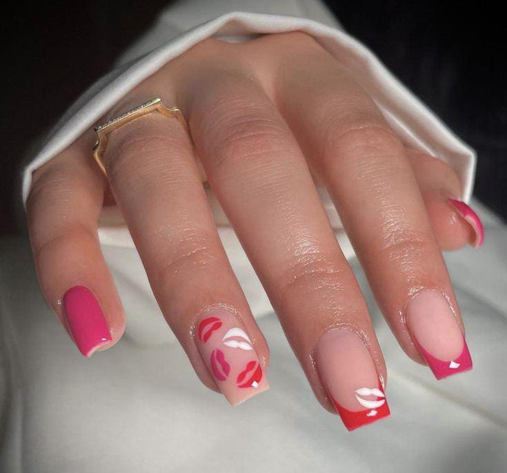 This design mixes nude-pink bases with bold pink French tips and cute kiss-print details. It has a fun, flirty feel that still looks polished and trendy Valentines.