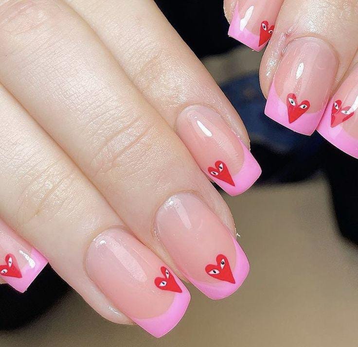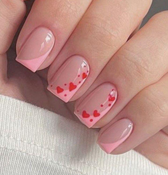 A pale pink French tip design is enhanced with tiny red hearts scattered delicately on a few nails. It feels sweet, simple, and perfect for a soft Valentine look.