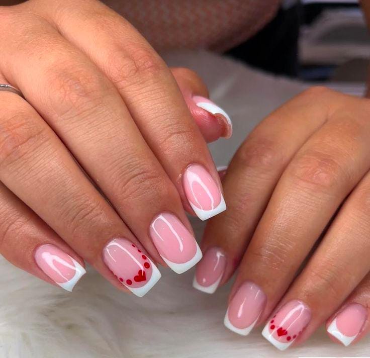 Milky pink nails feature crisp white French tips and small red heart accents for contrast. The vibe is fresh, romantic, and effortlessly classy Valentine’s feel.