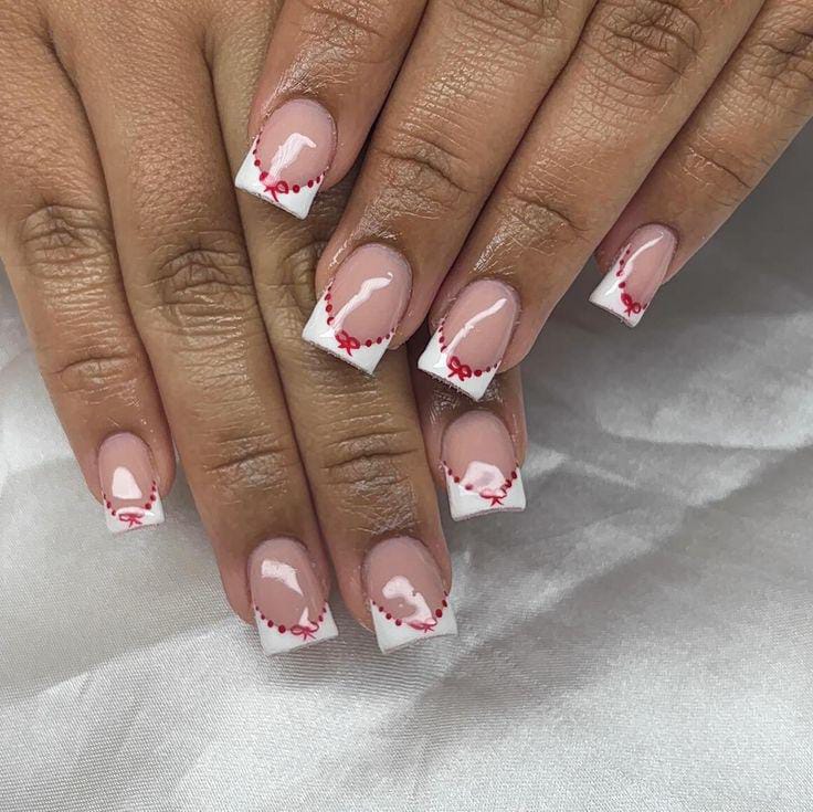 Classic white French tips are paired with tiny red bows and dotted heart details. This design feels dainty, girly, and slightly vintage- Valentine’s inspired.