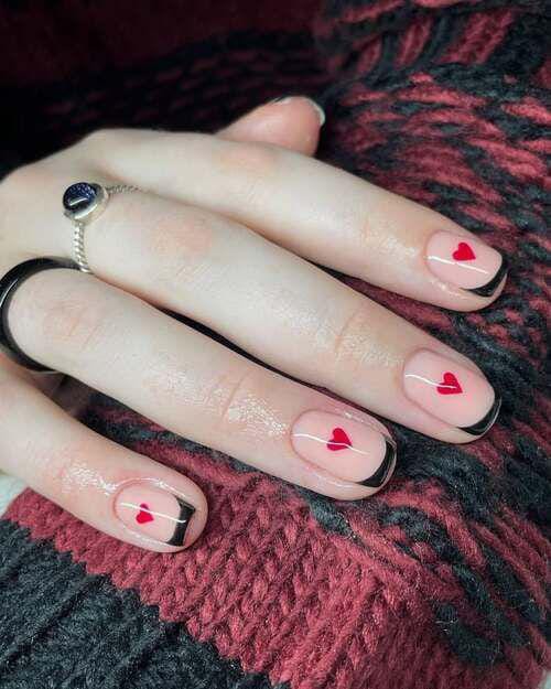 This design pairs sheer nude nails with thin black French tips and small red hearts. It has a modern, chic vibe with a subtle Valentine touch.