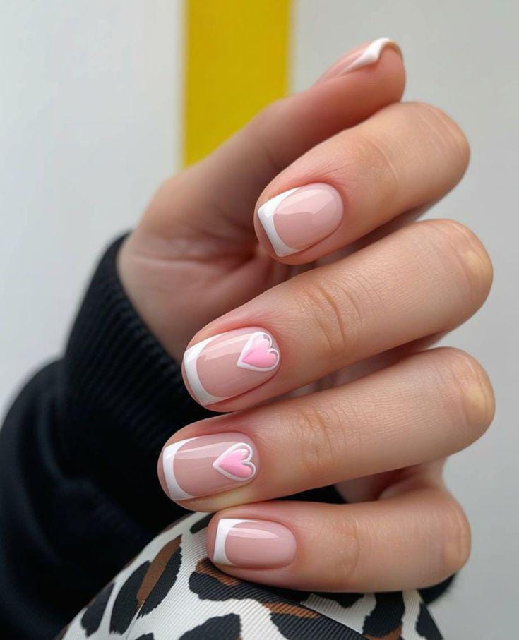 A natural nude base is paired with crisp white French tips and delicate pink heart outlines. The style feels elegant, simple, and sweet Valentine’s finish.