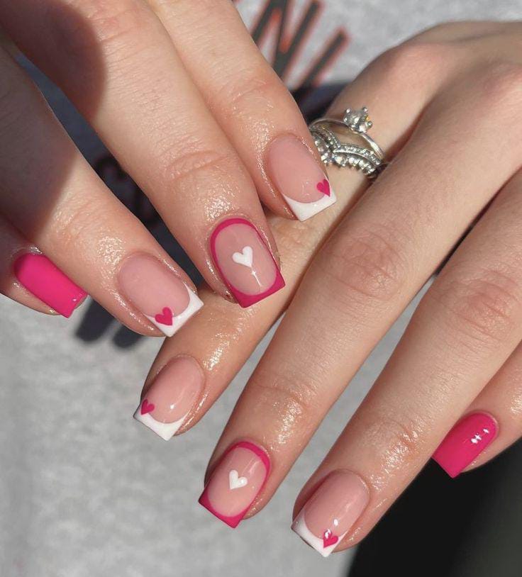 Soft nude nails are paired with classic white and pink French tips and tiny pink heart accents. The look feels romantic, polished, and perfect for Valentine’s Day.