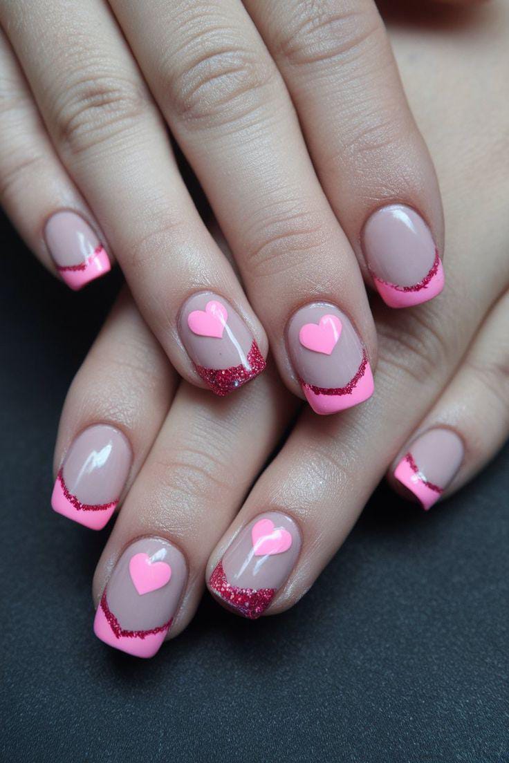 Neutral pink nails are finished with bright pink French tips and glitter accents around heart details. The design feels fun, flirty, and slightly bold Valentine’s look.