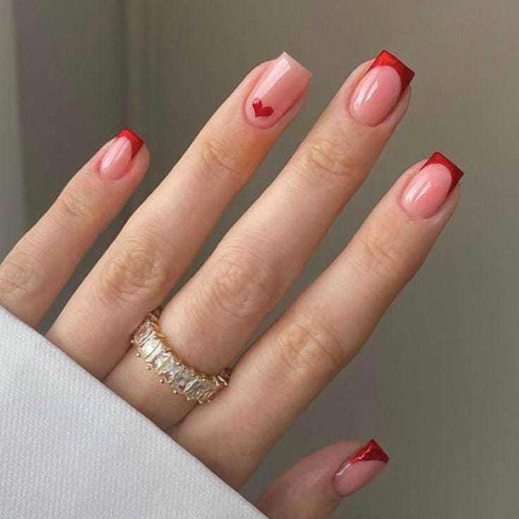 A natural pink base is combined with crisp red French tips and a single heart accent. The style is timeless, chic, and confidently romantic Valentines.