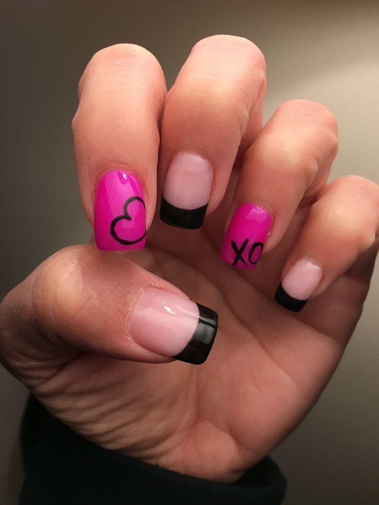 These short French tip nails mix glossy black tips with bright pink accent nails for a fun Valentine vibe. Simple heart and “XO” details add a cute, playful touch without feeling overdone.