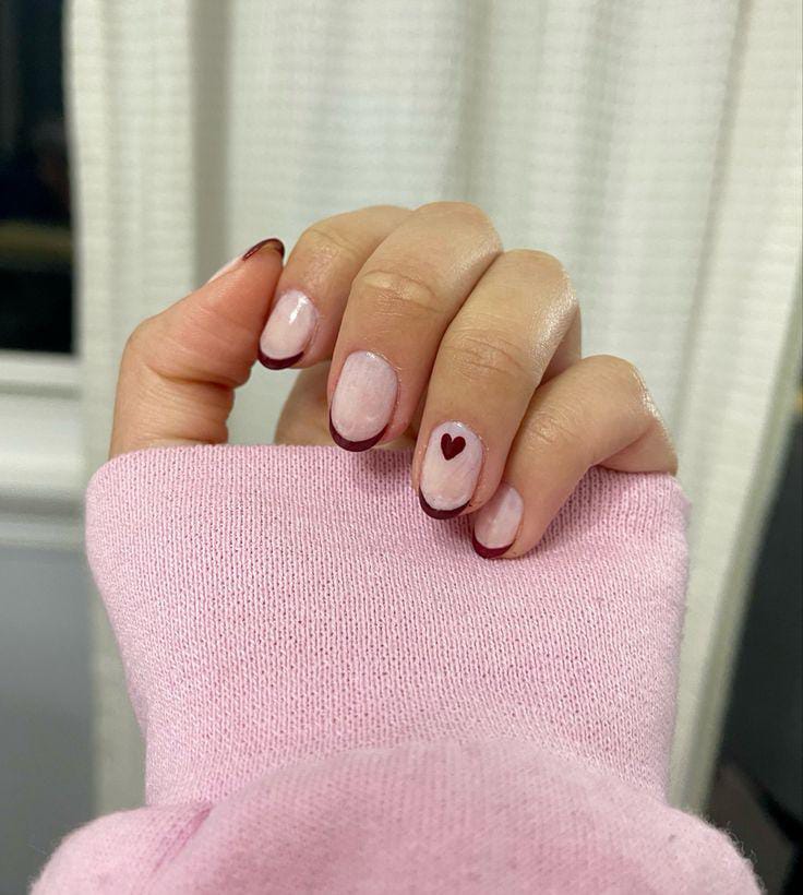 A muted nude base is paired with thin burgundy French tips and a single heart accent. The look is subtle, cozy, and perfect for a low-key Valentine aesthetic.