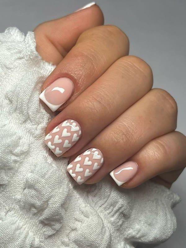 Short nude nails are finished with crisp white French tips and cute heart art in warm tones. The style feels cozy, minimal, and effortlessly charming Valentine’s feel.