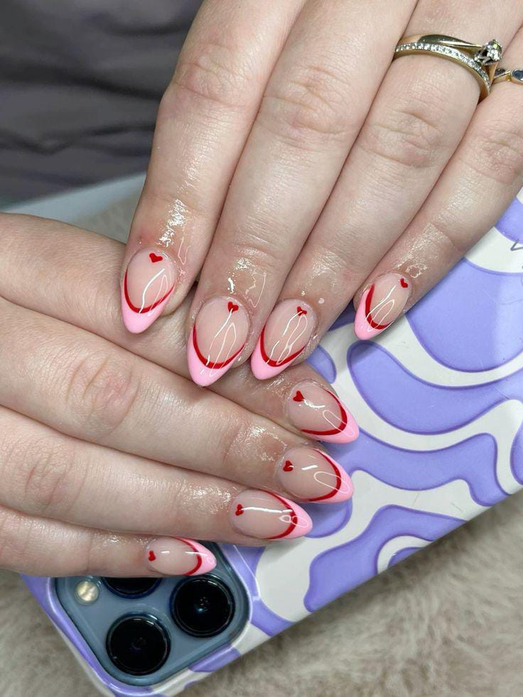 These nails showcase soft pink French tips with delicate red curved lines and tiny heart details. The overall style is playful, trendy, and very flirty Valentines without being loud.