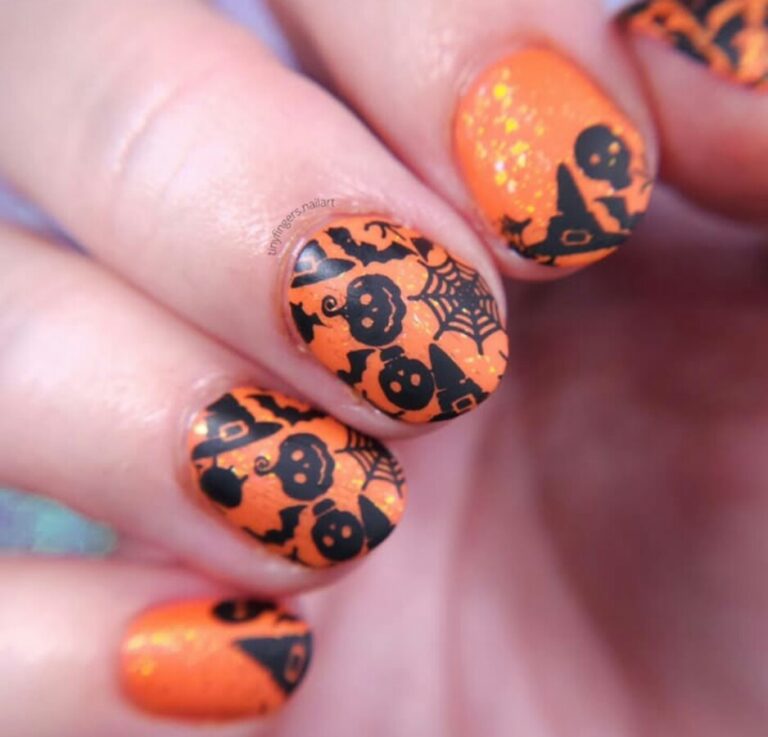 This bold orange base is brought to life with classic Halloween elements like jack-o’-lanterns, bats, skulls, witch hats, and spider webs in crisp black. It’s the perfect spooky season tribute for those who love traditional Halloween motifs on short nails.