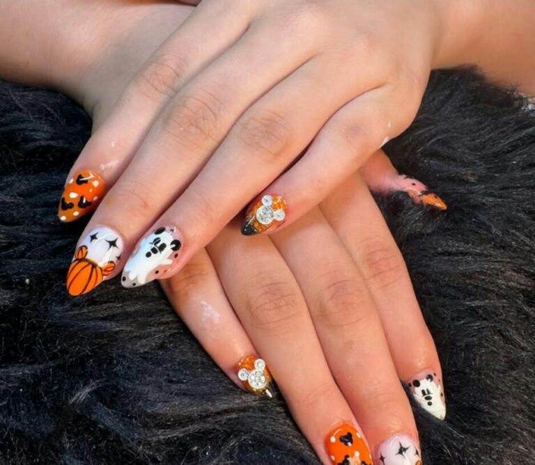 This playful set brings cartoon-like ghosts, pumpkins, and sparkling Mickey Mouse-inspired elements together in orange, white, and black. It’s a fun and quirky look that balances spooky with sweet on short, almond-shaped nails.