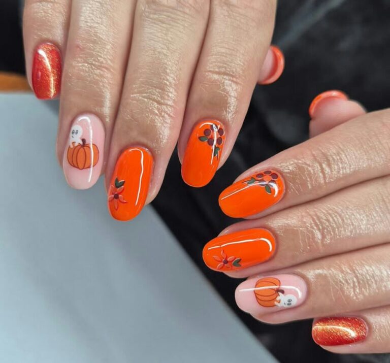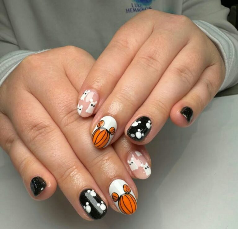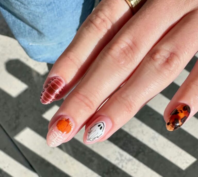 This creative mix blends nude tones with ghost and pumpkin nail art, along with tortoise shell and brown textures. It’s a stylish nod to Halloween that stays classy and wearable for all fall occasions.