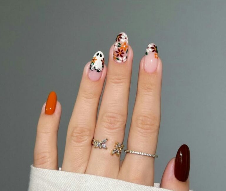This design combines cozy fall vibes with Halloween spirit. Floral accents in warm tones like orange, burgundy, and white sit atop a nude base, while one nail features a white ghost motif — giving it a spooky yet stylish finish.