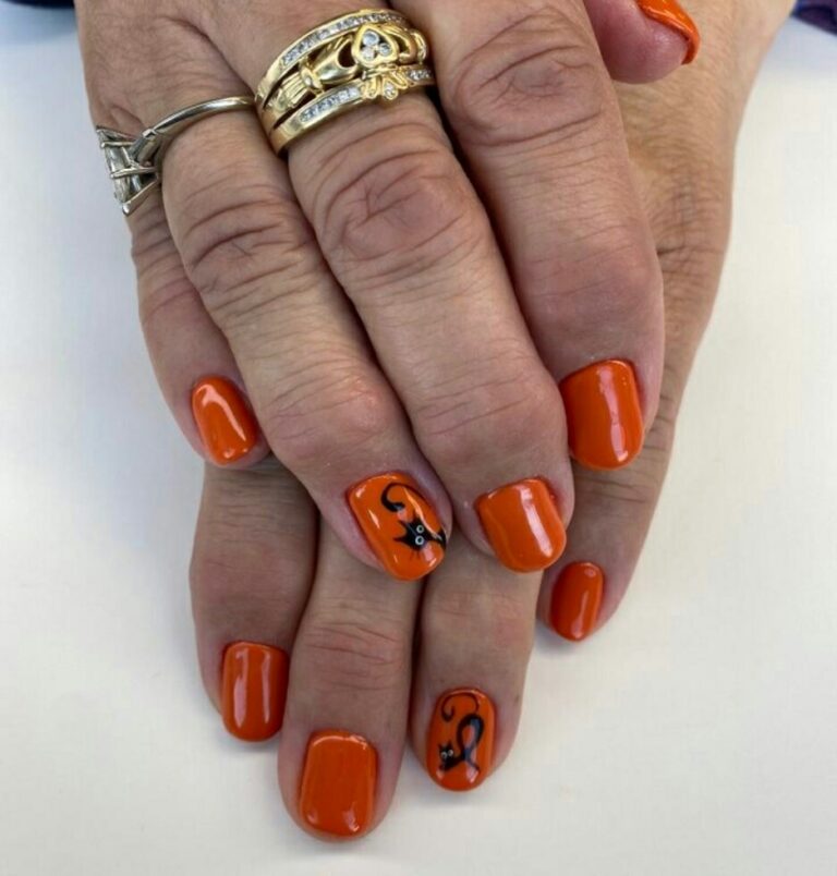 Solid orange nails get a whimsical upgrade with adorable black cat accents. It’s a classic Halloween motif brought to life in a compact, short nail style — playful, fun, and undeniably festive.