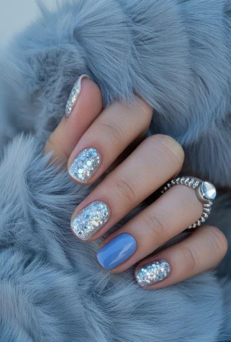 Chunky silver glitter nails mixed with one soft icy-blue nail create a cool, frosty style that’s sparkly yet simple—perfect for a fresh January manicure.