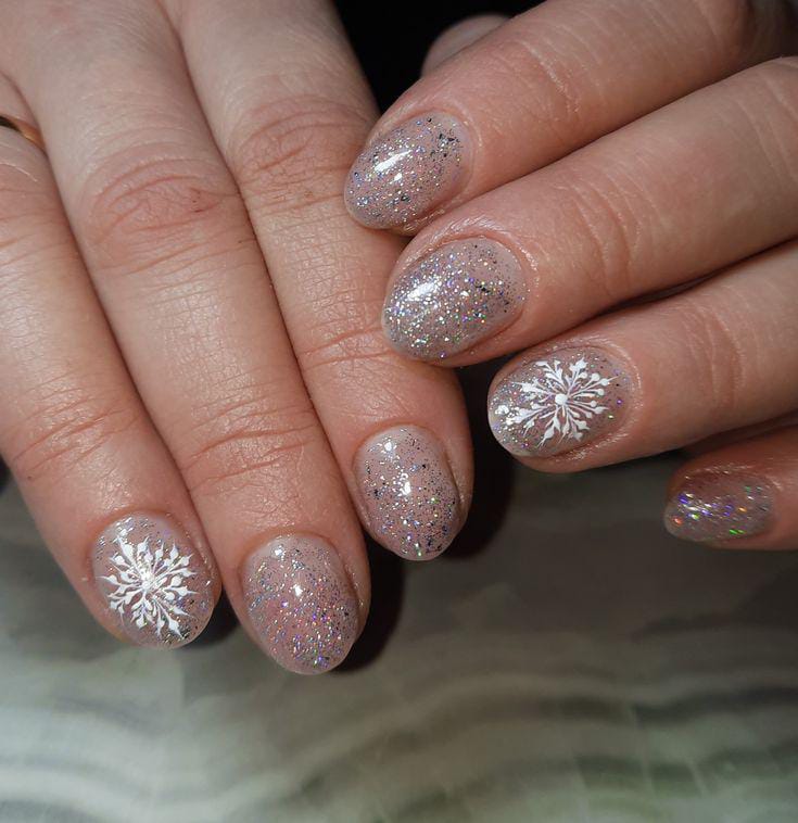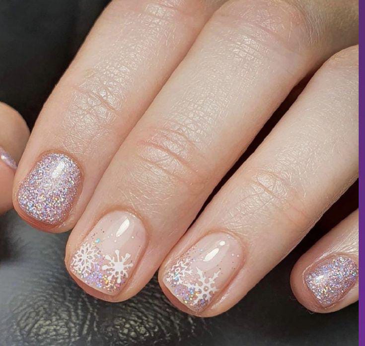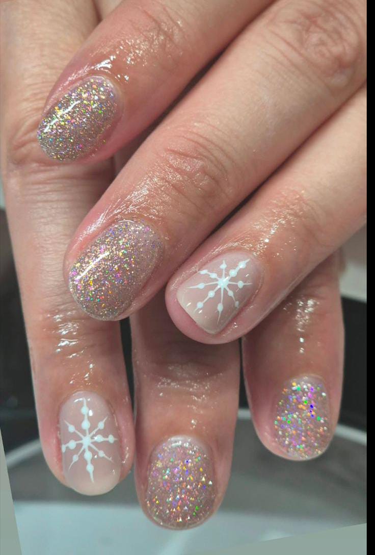 These short nails blend soft nude tones with dense holographic glitter and delicate white snowflake accents. The overall vibe is frosty, bright, and perfect for January.