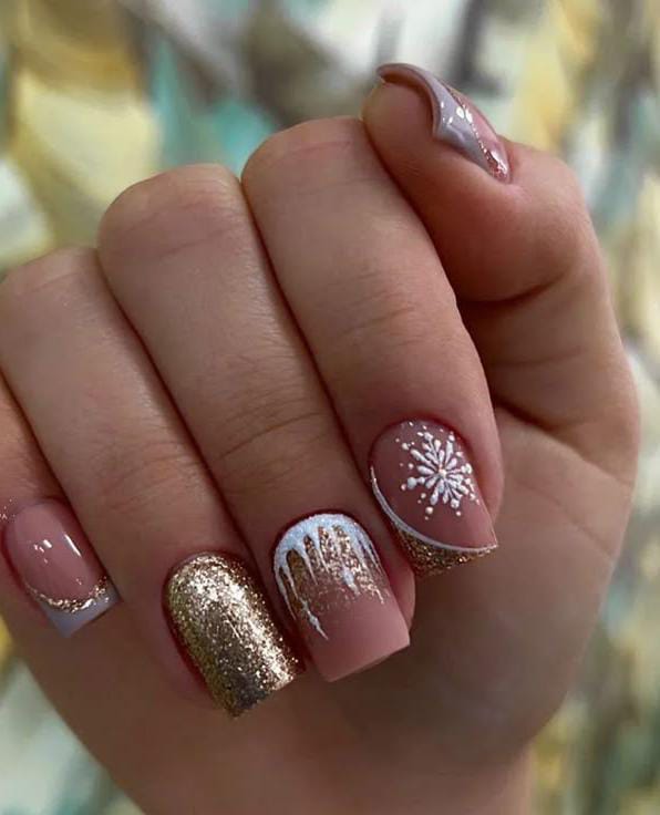 This set blends warm nude shades with rich gold glitter and crisp white accents, creating a stylish mix of shine and seasonal detailing. The snowflake and drip-like designs add a festive yet elegant January winter touch.