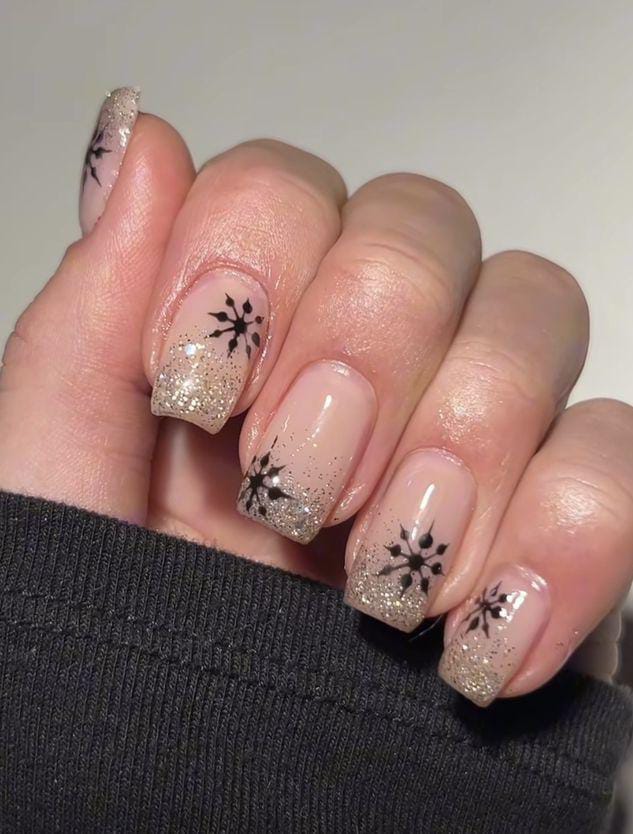 These nails feature a smooth nude-to-gold gradient with black snowflake accents that stand out beautifully against the soft background. It’s a simple but classy January look that mixes sparkle with clean winter motifs.